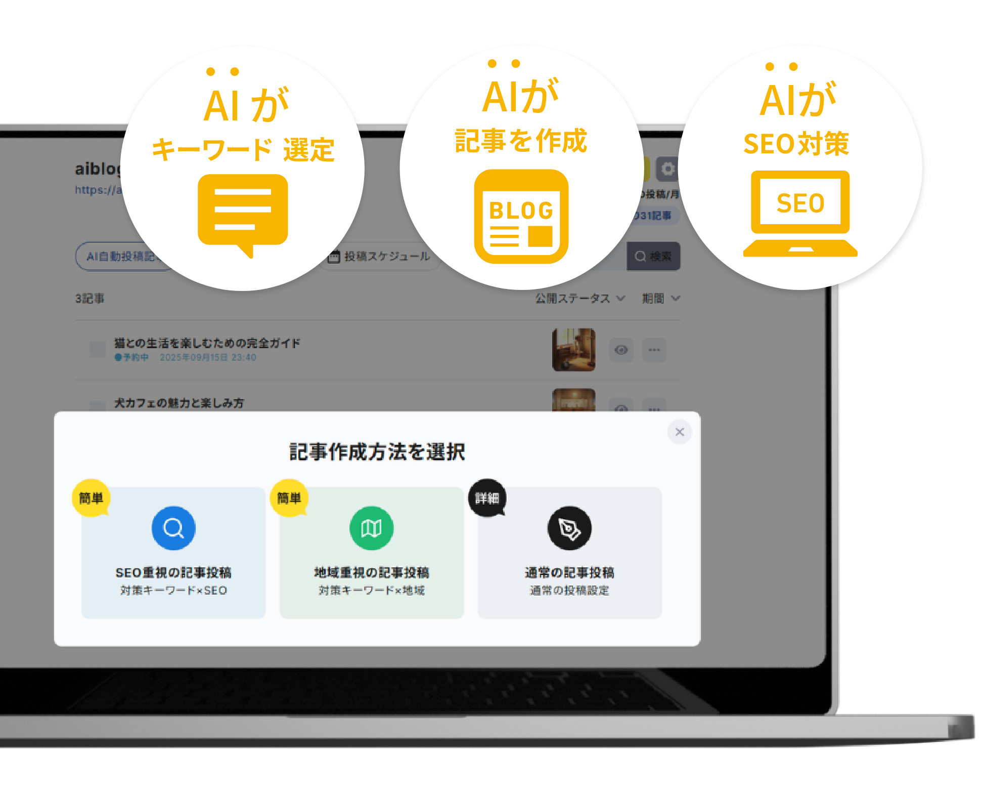 キーワードやテーマを入力するだけで、記事の下書きや構成を自動生成できます。さらに、生成した記事は予約投稿機能を使って、指定した日時に自動的に公開することも可能です。