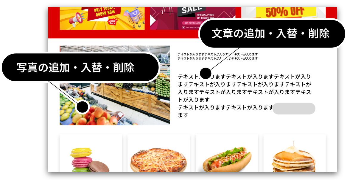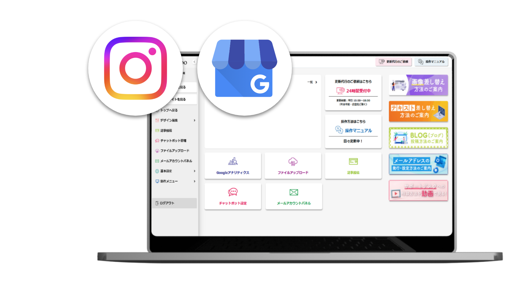 写真・文章の更新代行無制限、バナー制作(毎月1点無料)、遠隔サポート(画面共有)などを提供しています。